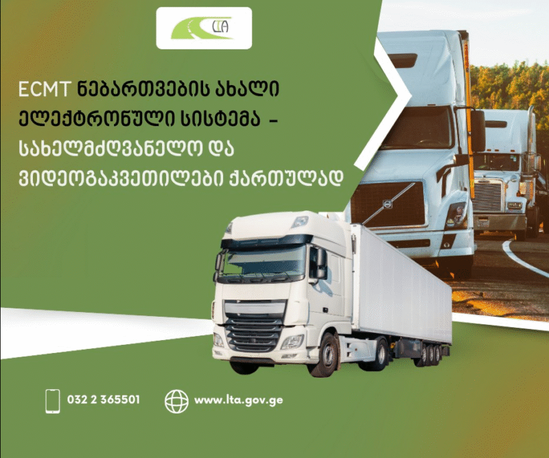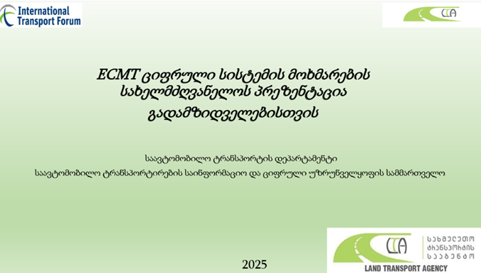 სახმელეთო ტრანსპორტის სააგენტომ ევროპის კონფერენციის ECMT მრავალმხრივი სანებართვო დოკუმენტებისა და შესაბამისი სააღრიცხვო წიგნების ახალი ელექტრონული სისტემის სახელმძღვანელოს, პრეზენტაციების და ვიდეოგაკვეთილების ქართულ ვერსიაზე მუშაობა დაასრულა.