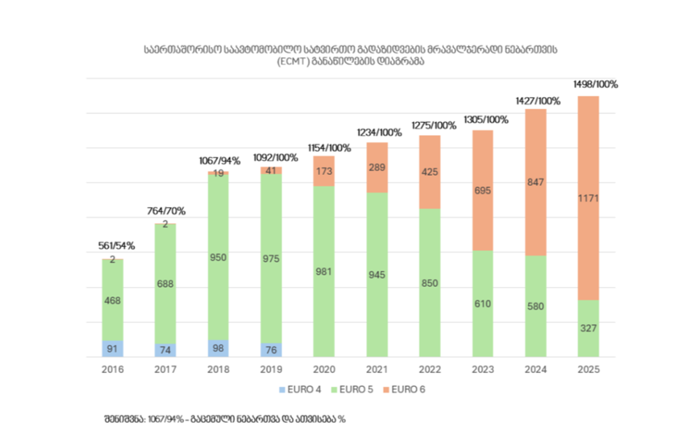 2025 წლისთვის გამოყოფილი 1498 ერთეული ნებართვა საქართველომ სრულად აითვისა, მათ შორის 1171 ერთეული ნებართვა ერგო ევრო 6 ტიპის სატრანსპორტო საშუალებებს, ხოლო 327 ერთეული ევრო 5 ტიპის სარანსპორტო საშუალებებს.