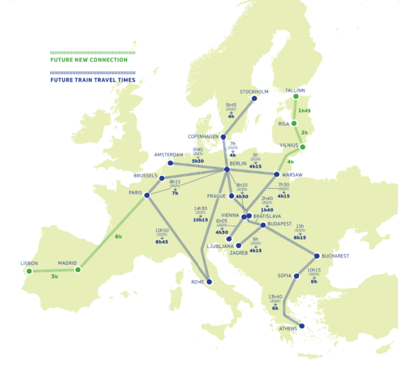 2035 წლისთვის სოფიიდან ათენამდე მგზავრობას 14 საათის ნაცვლად მხოლოდ 6 საათი დასჭირდება, ხოლო პარიზიდან რომამდე მგზავრობა 11 საათიდან 9 საათამდე შემცირდება. გარდა ამისა, ევროპაში ბევრ პოპულარულ ტურისტულ მიმართულებაზე მგზავრობის ხანგრძლივობა განახევრდება.