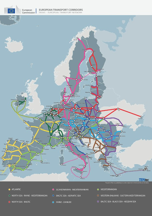 სადღეისოდ ტრანსევროპულ სატრანსპორტო ქსელებში TEN-T ევროკავშირის ქვეყნებში გამავალი სატრანსპორტო დერეფნებია გაერთიანებული (იხ სქემა).