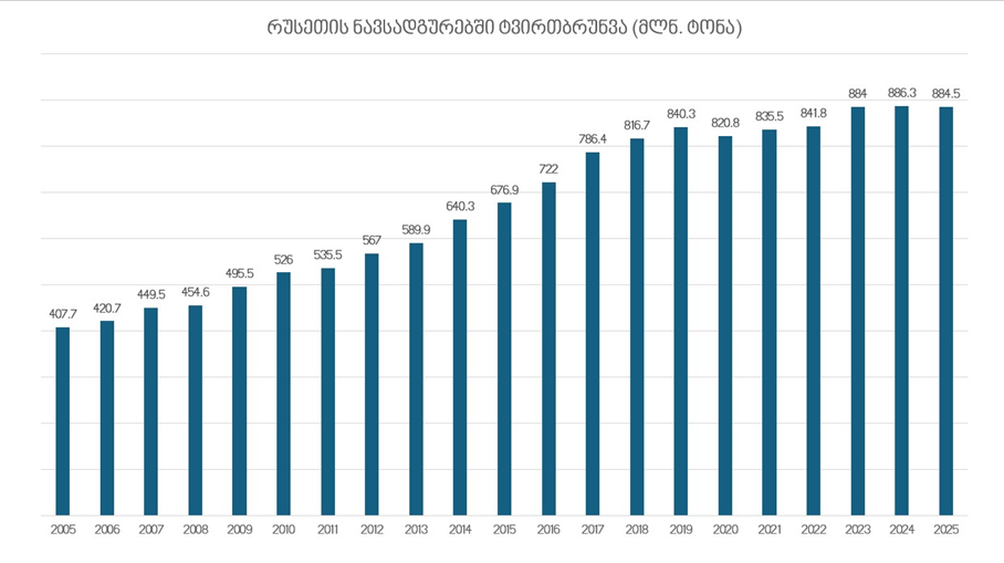 თუ მხედველობაში არ მივიღებთ კოვიდის 2020 წელს, მოქმედი სანქციების პირობებში, რუსეთის ნავსადგურების ტვირთბრუნვა, 2025 წლის გამოკლებით, ბოლო 20 წლის განმავლობაში ყოველწლიურად იზრდებოდა (იხ. დიაგრამა).