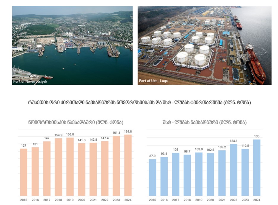 ნოვოროსიისკის ნავსადგურისთვის 2025 წელი სარეკორდო აღმოჩნდა – 168 მლნ ტონა, სქემაზე ნოვოროსიისკის გარდა რუსეთის მეორე მსხვილი ნავსადგურის, უსტ-ლუგის მონაცემებია მოყვანილი, რომელიც ბალტიის აუზშია განთავსებული (იხ. დიაგრამა).
