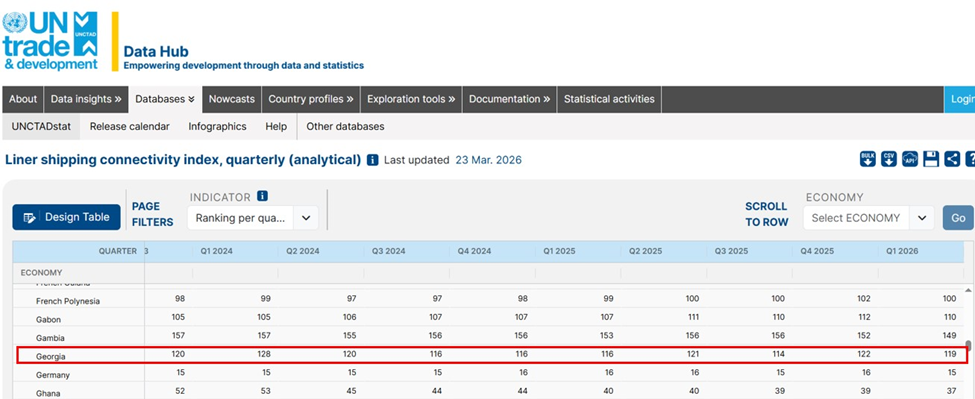 საქართველოს 119-ე საფეხურზე პოზიციონირება ნიშნავს, რომ ქვეყანა ჯერ კიდევ შორსაა რეგიონულ ჰაბად ჩამოყალიბებასთან – უმთავრესი პრობლემა არა ტვირთის ნაკლებობასთან ერთად, საზღვაო დაკავშირებადობის აუცილებელი სერვისების დონის ჩამორჩენილობაა.