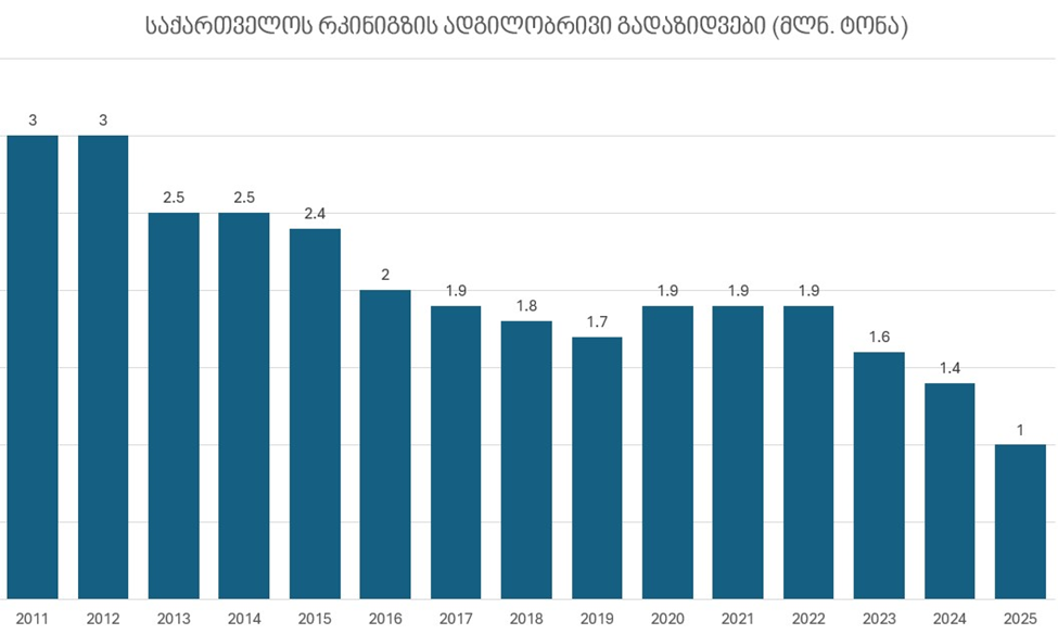 2011–2025 წწ. რკინიგზის ადგილობრივი გადაზიდვები – 3.0 მლნ ტონიდან 1.0 მლნ ტონამდე 3-ჯერ შემცირდა (იხ. დიაგრამა).