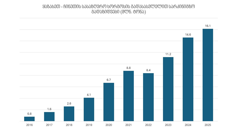 2025 წელს ყაზახეთს – ჩინეთს საზღვარზე, ხორგოსის რკინიგზის სასაზღვრო გამშვები პუნქტის გავლით, ტვირთბრუნვის მოცულობამ 16.1 მილიონი ტონა შეადგინა (იხ. დიაგრამა).