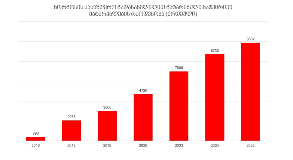 ბოლო 10 წელიწადში ხორგოსის სასაზღვრო პუნქტის გავლით ტვირთბრუნვა 20-ჯერ გაიზარდა. 2016 წელს ტერმინალით მხოლოდ 0.8 მლნ ტონა ტვირთი იქნა გატარებული, ხოლო 2025 წელს 16.1 მლნ ტონა.