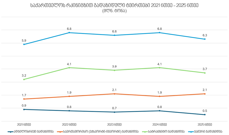 მაგრამ, რეალურად სატრანზიტო გადაზიდვები, ბოლო სამ წელიწადში არა თუ გაიზარდა არამედ 0.4 მლნ ტონით შემცირდა და 2025 წლის 6 თვეში 3.7 მლნ ტონის დონეზე დაფიქსირდა.