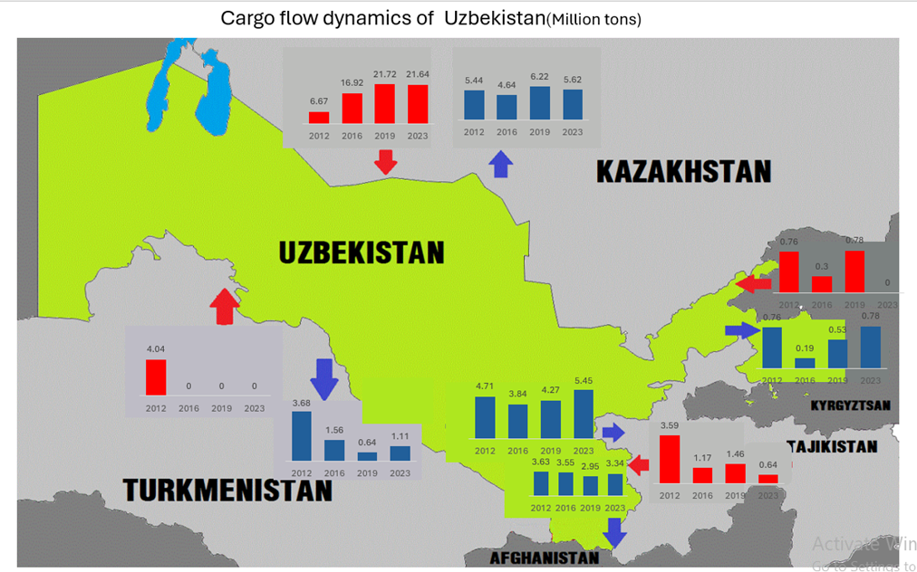 კვლევით დგინდება, რომ 2023 წელს უზბეკეთის მეზობელ ქვეყნებთან (ყაზახეთი, თურქმენეთი, ყირგიზეთი, ტაჯიკეთი, ავღანეთი) გენერირებული ტვირთნაკადადი ჯამური მაჩვენებელი 40 მლნ ტონას შეადგენს.