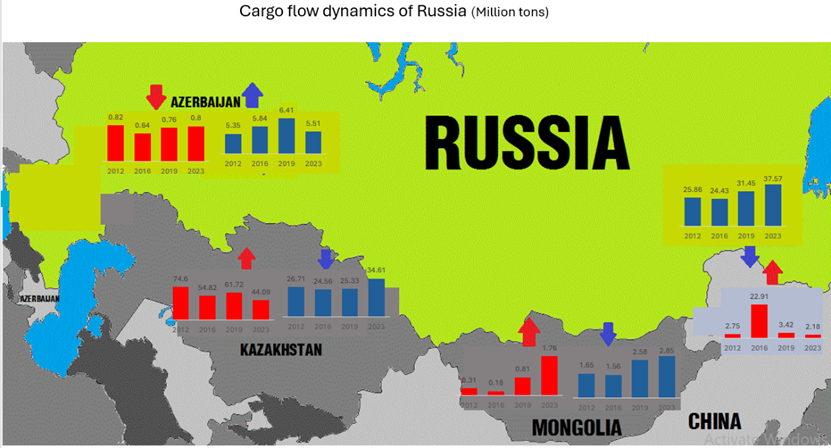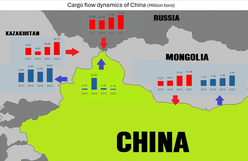 ჩინეთსა და სამ მეზობელ სახმელეთო სახელმწიფოსთან ყაზახეთი, რუსეთი, მონღოლეთი) ტვირთნაკადების მოძრაობის ანალიზმა წარმოაჩინა, რომ 2023 წელს სამივე სახელმწიფოდან, სარკინიგზო ტრანსპორტით – ჩინეთში შეტანილი ტვირთების მოცულობები 5 ჯერ აღემატება (შეტანილი – 69 მლნ ტონა, გამოტანილი 13 მლნ ტონა), ჩინეთიდან უკანა მიმართულებით ამ ქვეყნებში მიწოდებულ ტვირთებს, რითაც კიდევ ერთხელ დასტურდება, რომ სახმელეთო სარკინიგზო გადაზიდვებისათვის ჩინეთი არ წარმოადგენს ტვირთნაკადების მაფორმირებელ სახელმწიფოს.