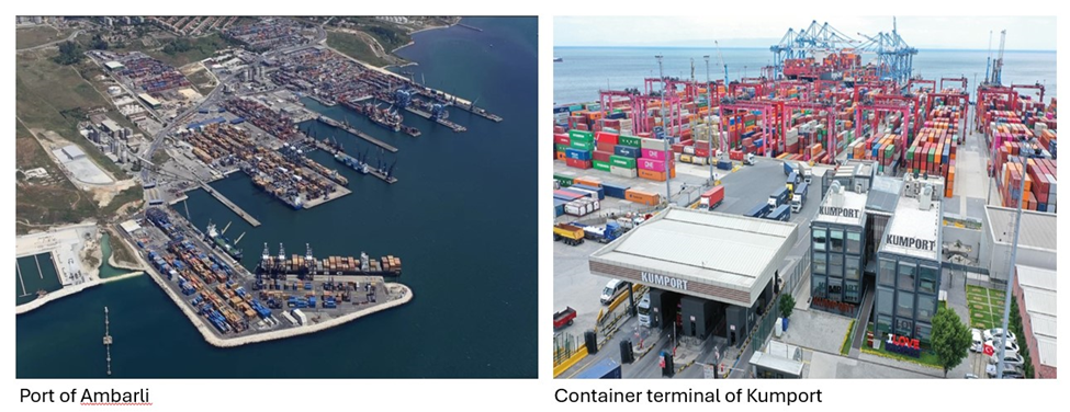 გეოგრაფიული მდებარეობით განპირობებული ბოსფორისა და დარდანელის სრუტეების კონტროლის გარდა, თურქეთი ძლიერ და კონკურენტუნარიან, მძლავრ ნავსადგურებს ფლობს. მათ შორის, სტამბოლის სიახლოვეს რამდენიმე მძლავრი ნავსადგურია თავმოყრილი, ამბარლისა და კუმპორტის ტერმინალების სახით, რომლებიც ძირითად ტრანსშიფმენტის ჰაბებად – ანუ ტვირთების სხვადასხვა მიმართულებით გამანაწილებელ ნავსადგურებად ფუნქციონირებენ.